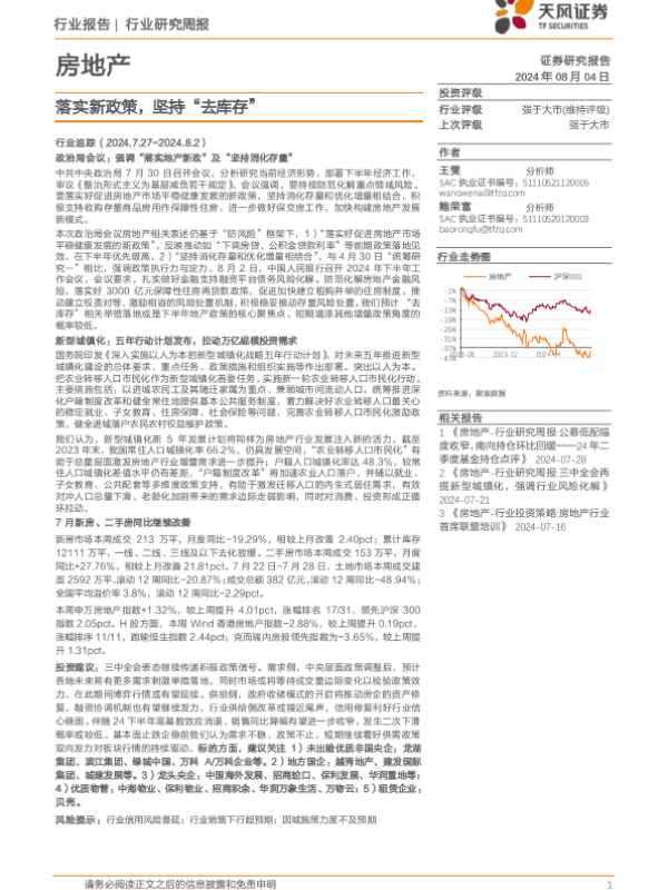 【天风证券】【20240804】房地产行业报告:落实新政策,坚持“去库存”-15页