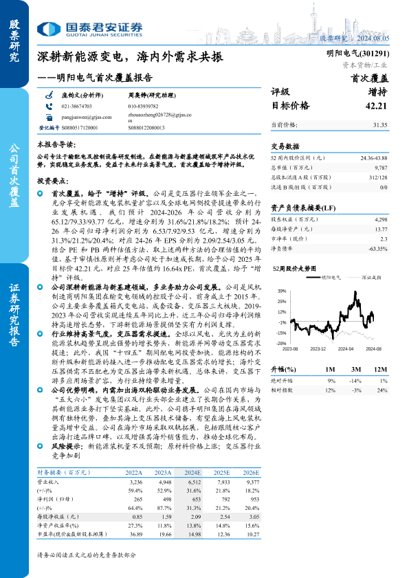 【国泰君安证券】【20240805】明阳电气(301291)首次覆盖报告:深耕新能源变电,海内外需求共振-20页