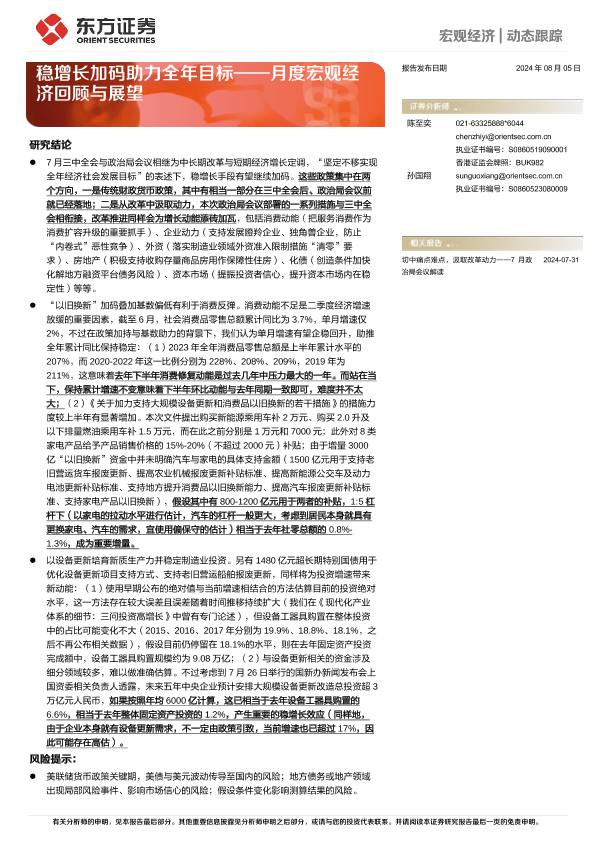 【东方证券】【20240805】月度宏观经济回顾与展望:稳增长加码助力全年目标-10页
