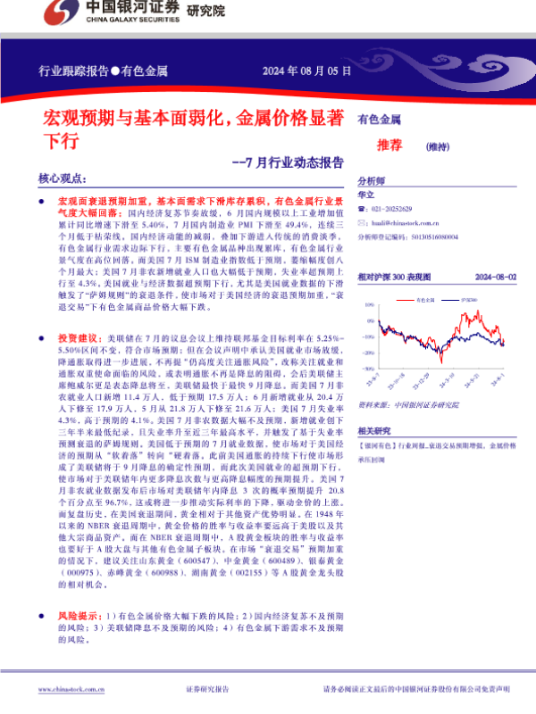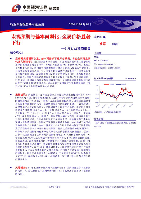【银河证券】【20240805】有色金属行业7月行业动态报告:宏观预期与基本面弱化,金属价格显著下行-24页