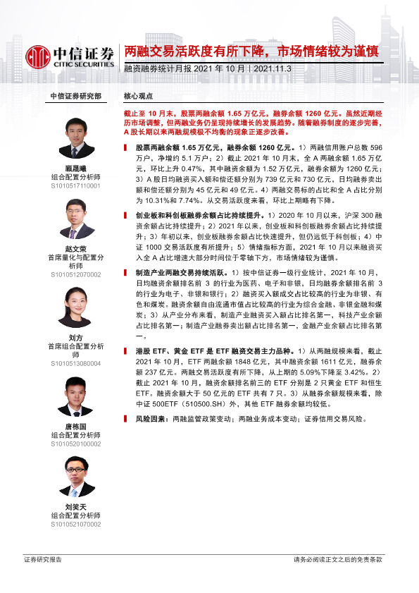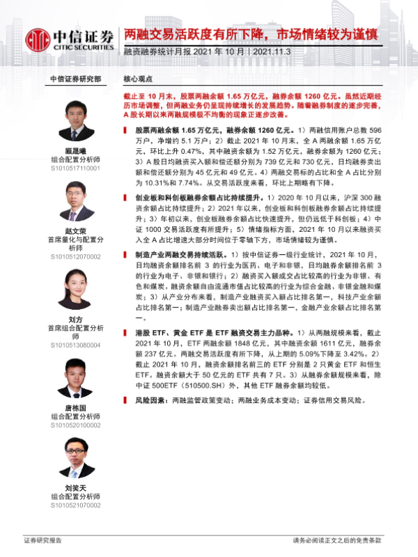 【中信证券】【20211103】融资融券统计月报2021年10月:两融交易活跃度有所下降,市场情绪较为谨慎-15页