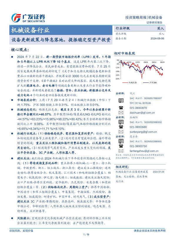 【广发证券】【20240806】机械设备行业:设备更新政策与降息落地,提振稳定型资产投资-19页