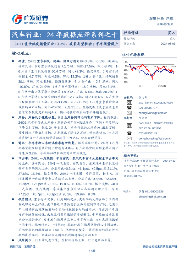 【广发证券】【20240803】汽车行业-24年数据点评系列之十:24H1重卡批发销量同比+3.3%,政策有望拉动下半年销量提升-23页