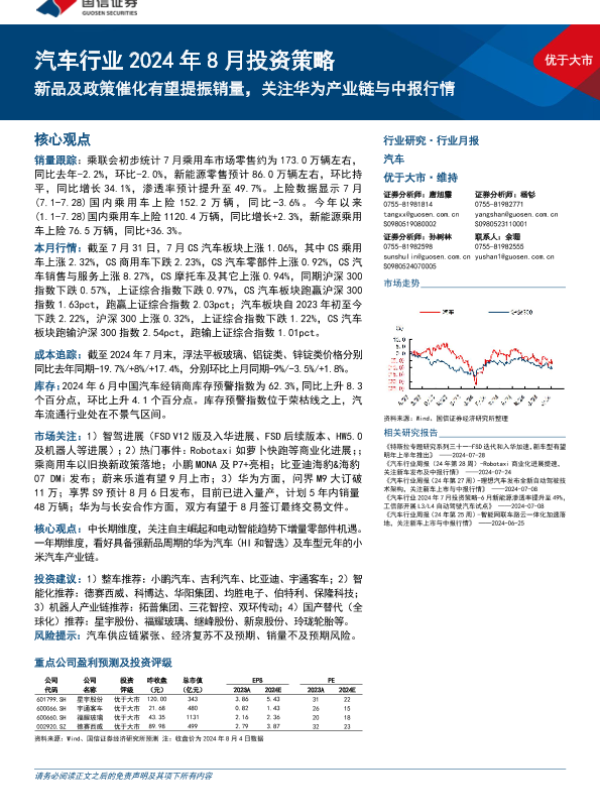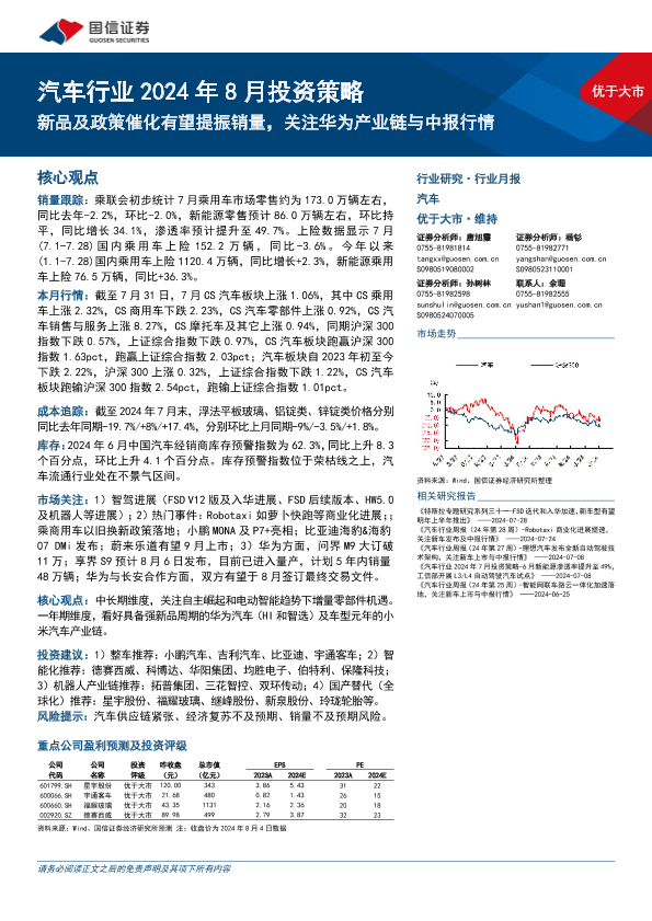 【国信证券】【20240806】汽车行业2024年8月投资策略:新品及政策催化有望提振销量,关注华为产业链与中报行情-32页