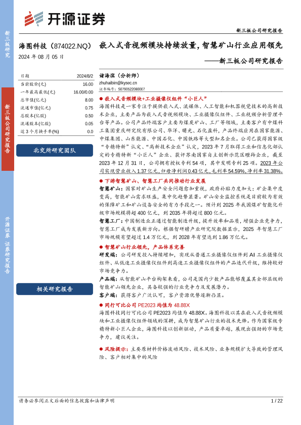 【开源证券】【20240805】海图科技(874022)新三板公司研究报告:嵌入式音视频模块持续放量,智慧矿山行业应用领先-22页