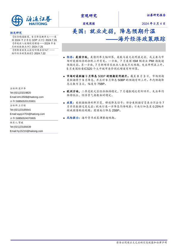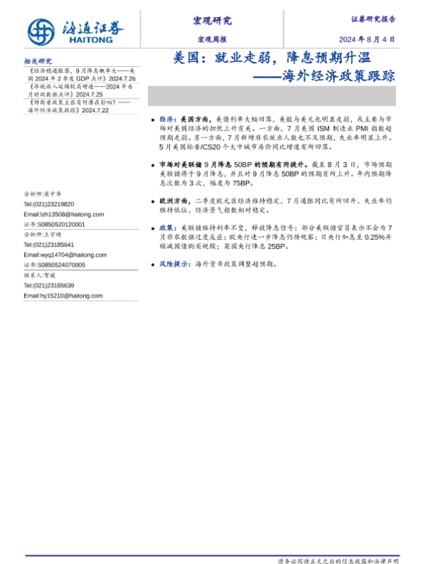 【海通证券】【20240804】美国:就业走弱,降息预期升温 ——海外经济政策跟踪-10页