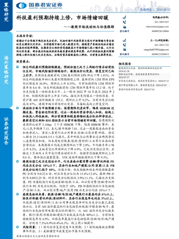 【国泰君安证券】【20240802】港股市场流动性与估值跟踪:科技盈利预期持续上修,市场情绪回暖-10页