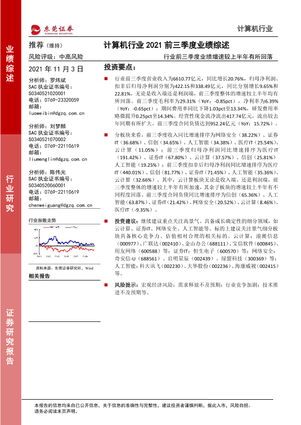 【东莞证券】【20211103】计算机行业2021前三季度业绩综述:行业前三季度业绩增速较上半年有所回落-20页
