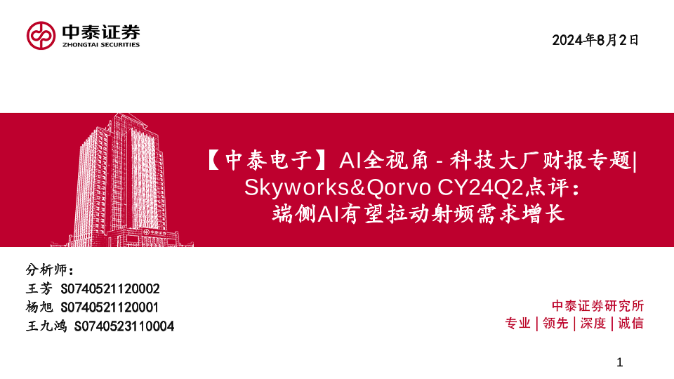 【中泰证券】【20240802】电子行业AI全视角-科技大厂财报专题|Skyworks&Qorvo CY24Q2点评:端侧AI有望拉动射频需求增长-16页