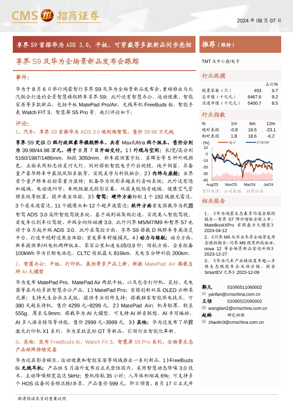 【海通证券】【20240807】电子行业享界S9及华为全场景新品发布会跟踪:享界S9首搭华为ADS+3.0,平板、可穿戴等多款新品同步亮相-13页