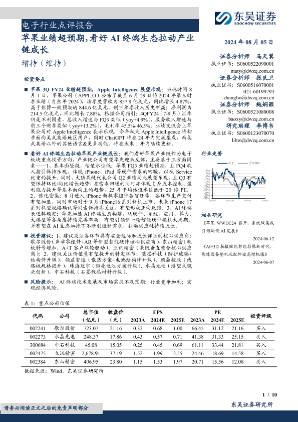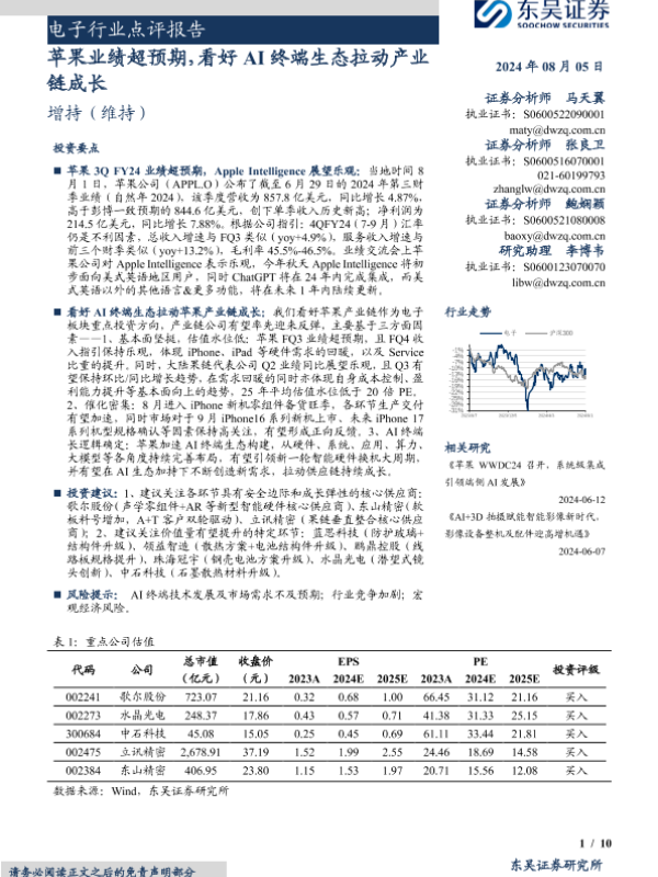 【东吴证券】【20240805】电子行业点评报告:苹果业绩超预期,看好AI终端生态拉动产业链成长-10页
