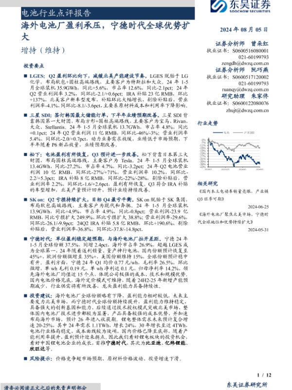 【东吴证券】【20240805】电池行业点评报告:海外电池厂盈利承压,宁德时代全球优势扩大-12页