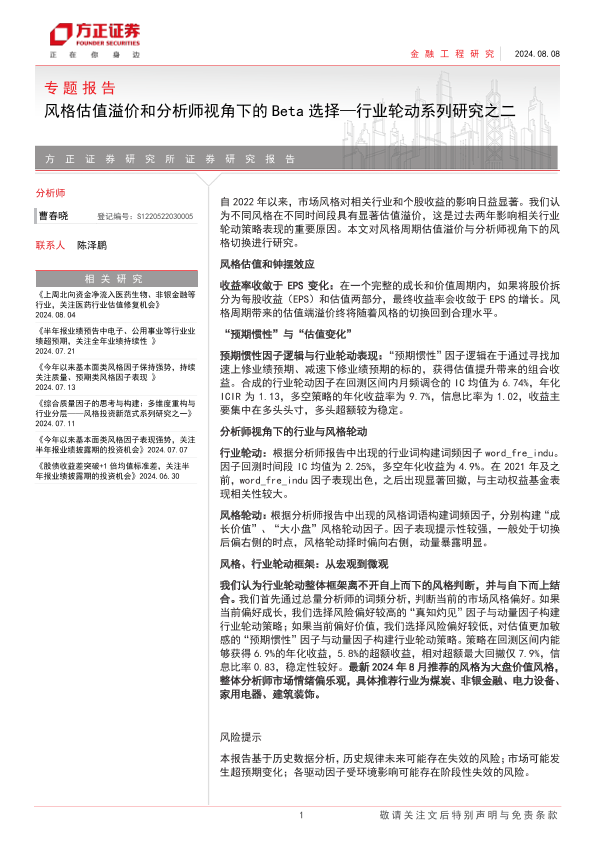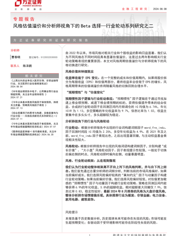 【方正证券】【20240808】风格估值溢价和分析师视角下的Beta选择—行业轮动系列研究之二-22页