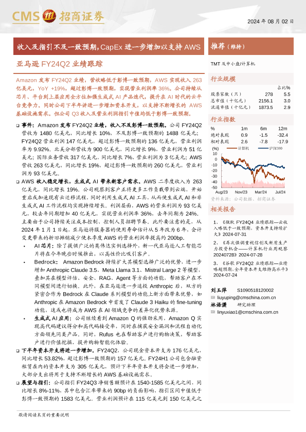 【海通证券】【20240802】计算机行业亚马逊FY24Q2业绩跟踪:收入及指引不及一致预期,CapEx进一步增加以支持AWS-16页