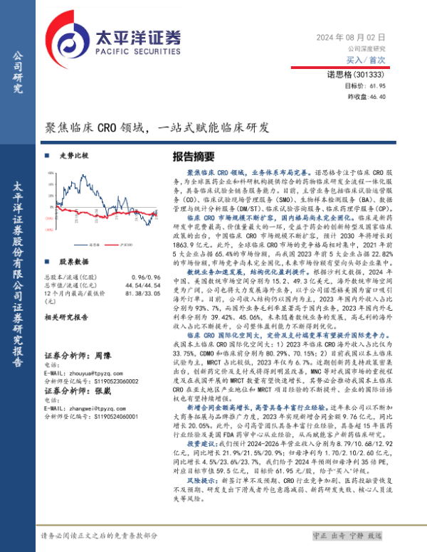 【太平洋证券】【20240802】诺思格(301333)聚焦临床CRO领域,一站式赋能临床研发-32页