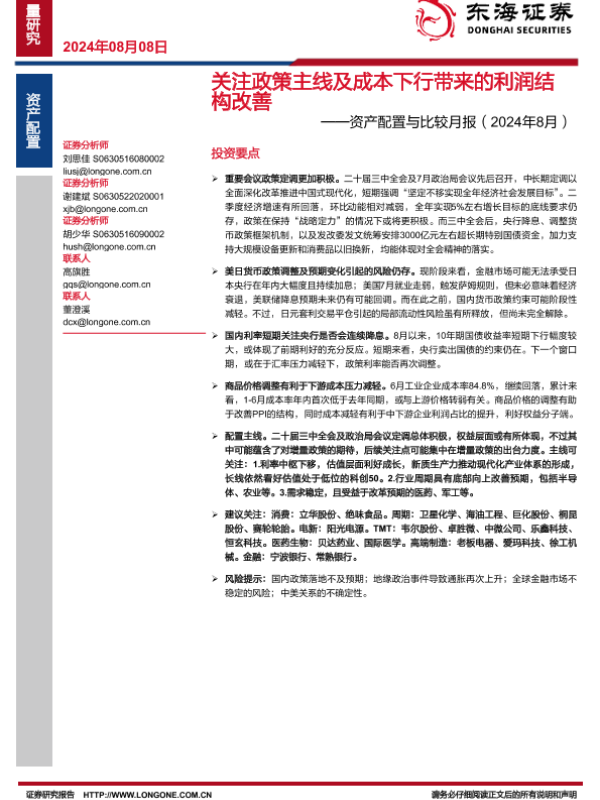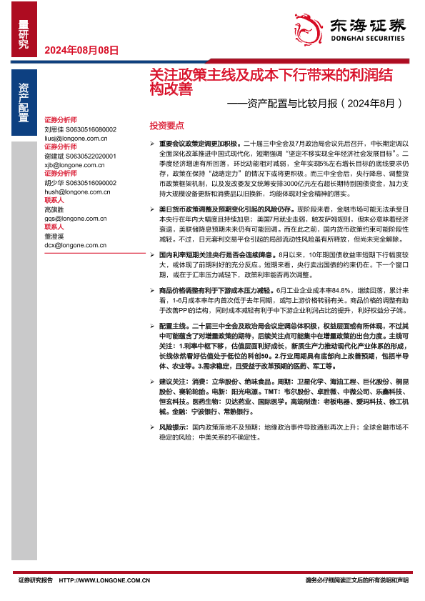 【东海证券】【20240808】资产配置与比较月报(2024年8月):关注政策主线及成本下行带来的利润结构改善-28页