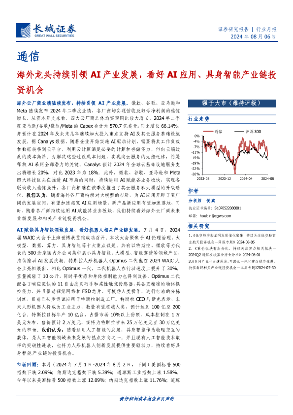 【长城证券】【20240806】通信行业月报:海外龙头持续引领AI产业发展,看好AI应用、具身智能产业链投资机会-18页