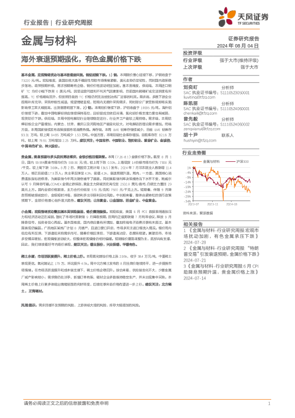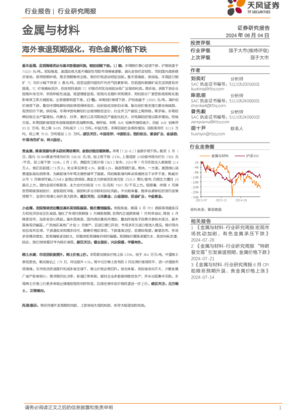 【天风证券】【20240804】金属与材料行业报告:海外衰退预期强化,有色金属价格下跌-17页