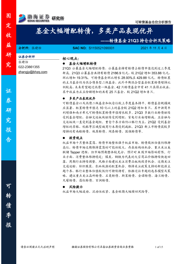 【渤海证券】【20211104】转债基金21Q3持仓分析及策略:基金大幅增配转债,多类产品表现优异-15页