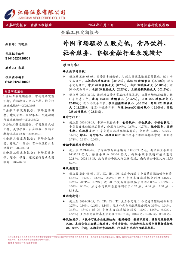 【江海证券】【20240806】金融工程定期报告:外围市场驱动A股走低,食品饮料、社会服务、非银金融行业表现较好-13页