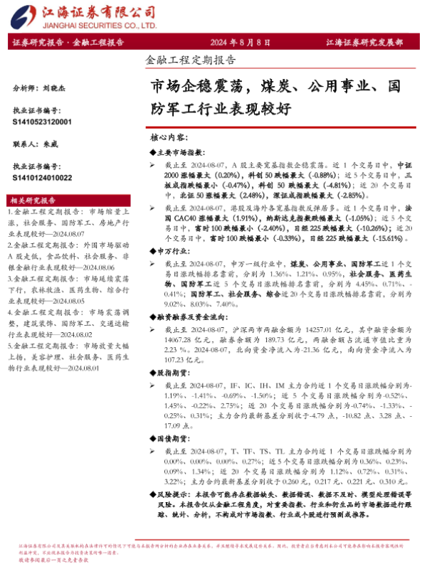 【江海证券】【20240808】金融工程定期报告:市场企稳震荡,煤炭、公用事业、国防军工行业表现较好-13页