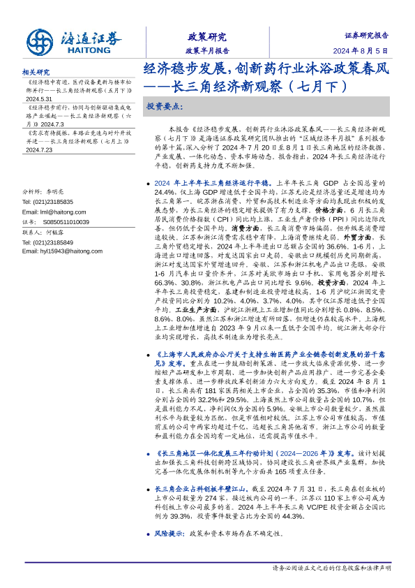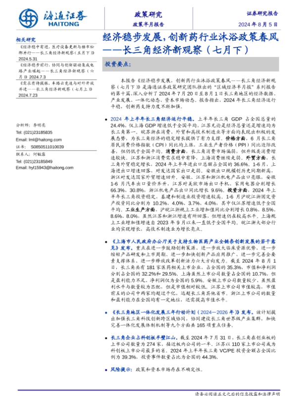 【海通证券】【20240805】经济稳步发展,创新药行业沐浴政策春风 ——长三角经济新观察(七月下)-15页