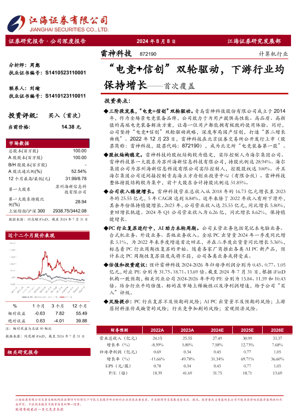 【江海证券】【20240808】雷神科技(872190)首次覆盖:“电竞%2b信创”双轮驱动,下游行业均保持增长-30页