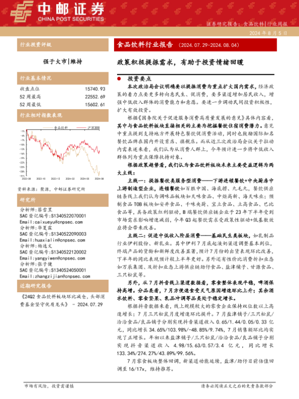 【中邮证券】【20240805】食品饮料行业报告:政策积极提振需求,有助于投资情绪回暖-24页