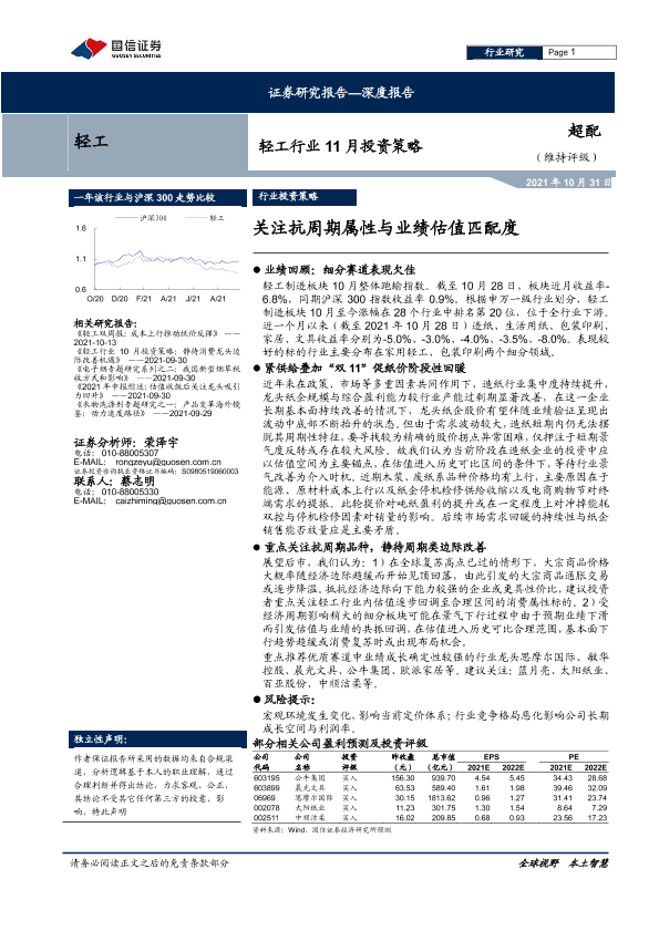 【国信证券】【20211031】轻工行业11月投资策略:关注抗周期属性与业绩估值匹配度-22页