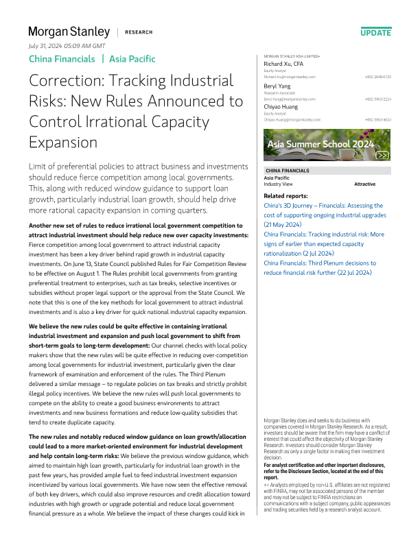 【Morgan Stanley】【20240729】China Financials Correction Tracking Industrial Risks New Rules Announced to Control Irrational Capacity Expansion-10页