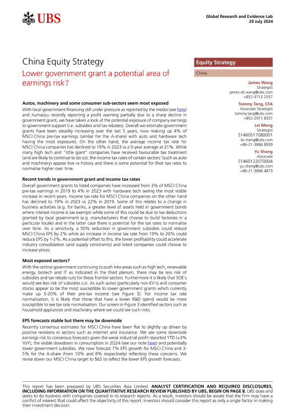 【UBS Securities Asia Limited】【20240729】UBS Equities-China Equity Strategy Lower government grant a potential area of earnings risk-13页