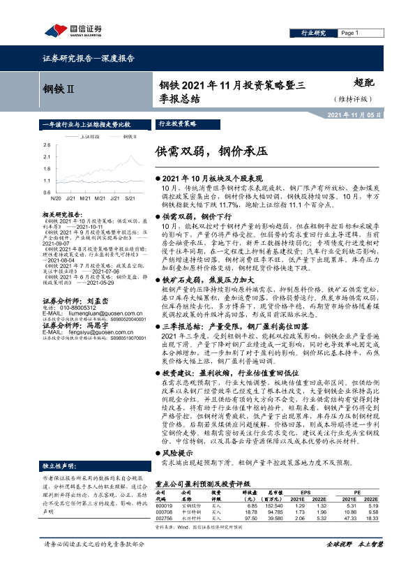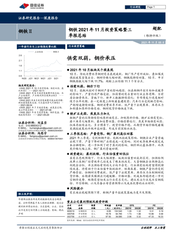 【国信证券】【20211105】钢铁行业2021年11月投资策略暨三季报总结:供需双弱,钢价承压-20页
