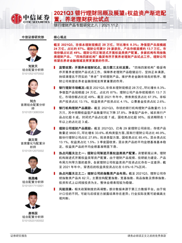 【中信证券】【20211102】银行业理财产品专题研究之八:2021Q3银行理财回顾及展望,权益资产渐进配置,养老理财获批试点-25页