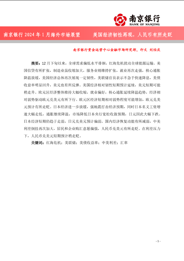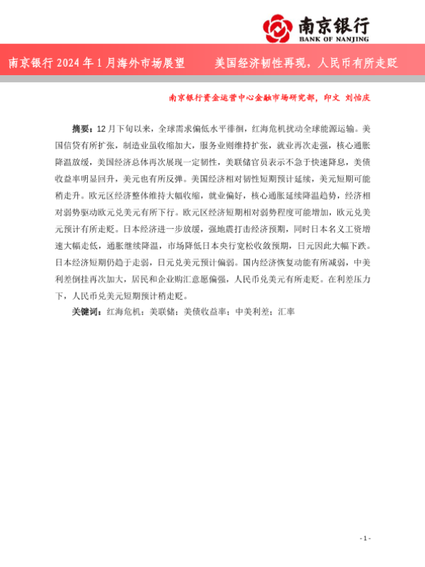 【南京银行资金运营中心金融市场研究部】【202401】美国经济韧性再现,人民币有所走贬——南京银行2024年1月海外市场展望-27页