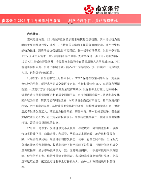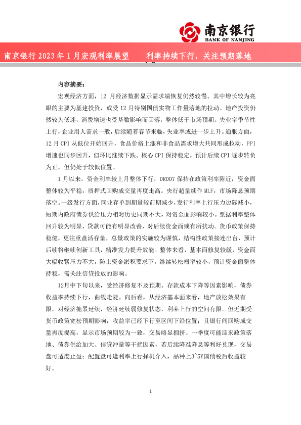【南京银行】【20240122】2023年1月宏观利率展望:利率持续下行,关注预期落地-31页