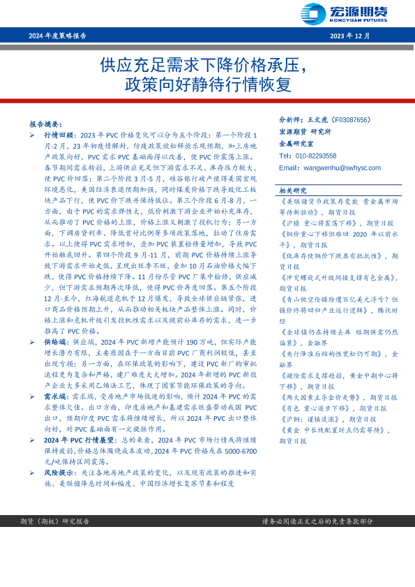 【宏源期货】【20231231】2024年度策略报告:供应充足需求下降价格承压,政策向好静待行情恢复-21页