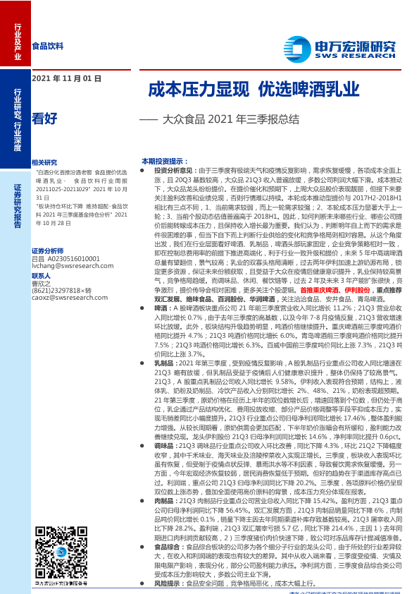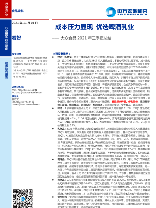 【申万宏源】【20211101】食品饮料行业大众食品2021年三季报总结:成本压力显现,优选啤酒乳业-24页
