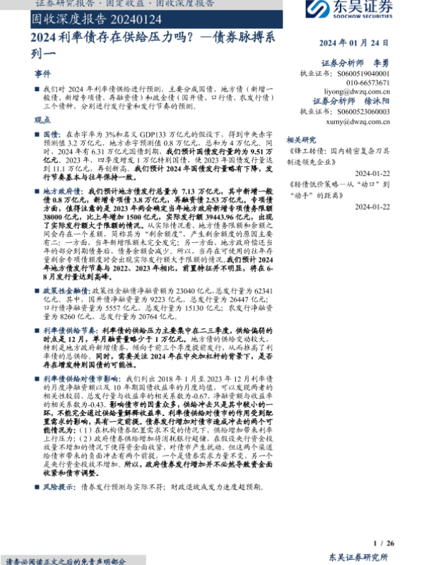 【东吴证券】【20240124】2024利率债存在供给压力吗?—债券脉搏系列一-26页