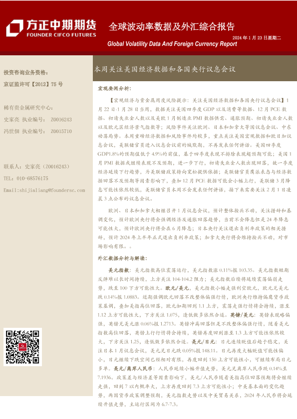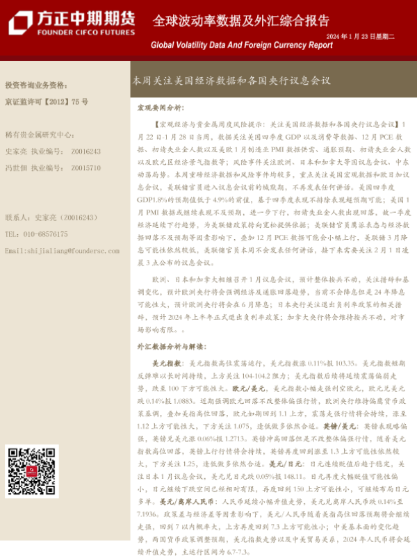 【方正中期期货】【20240123】全球波动率数据及外汇综合报告:本周关注美国经济数据和各国央行议息会议-18页