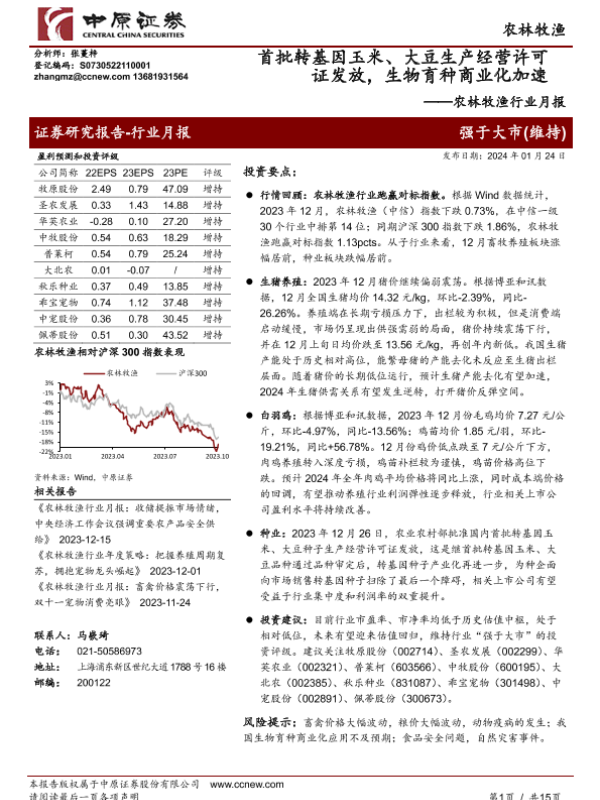 【中原证券】【20240124】农林牧渔行业月报:首批转基因玉米、大豆生产经营许可证发放,生物育种商业化加速-15页