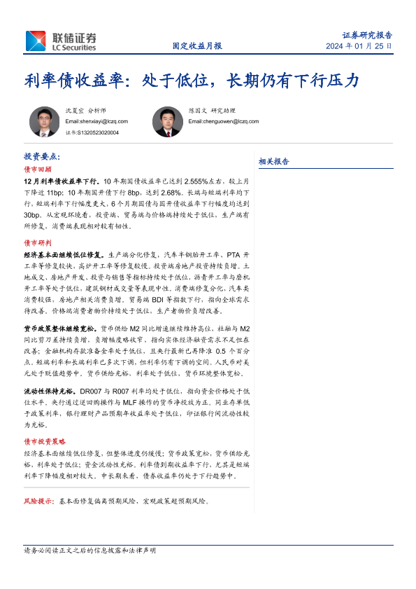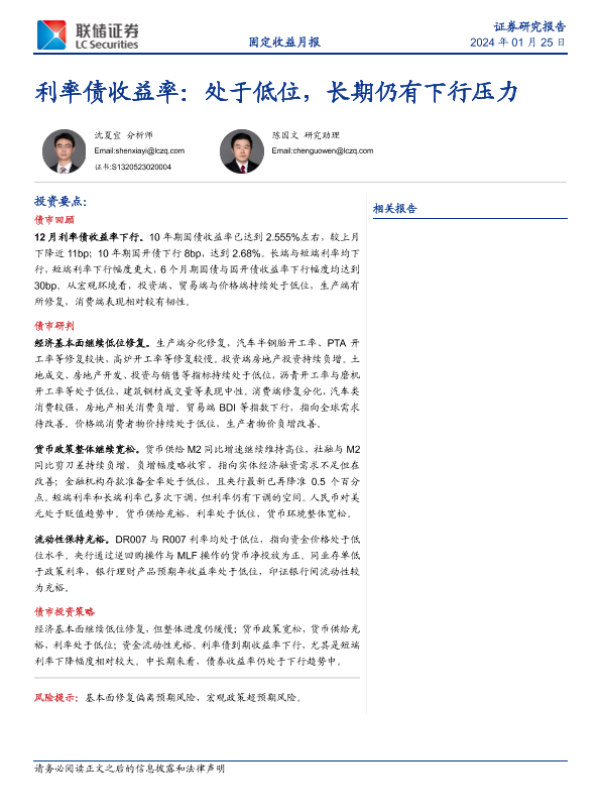 【联储证券】【20240125】利率债收益率:处于低位,长期仍有下行压力-26页