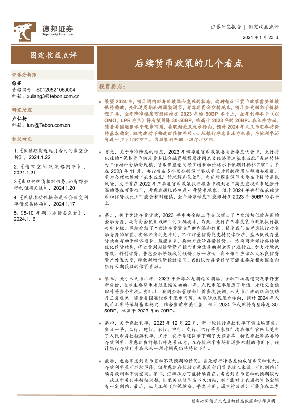 【德邦证券】【20240123】固定收益点评:后续货币政策的几个看点-11页