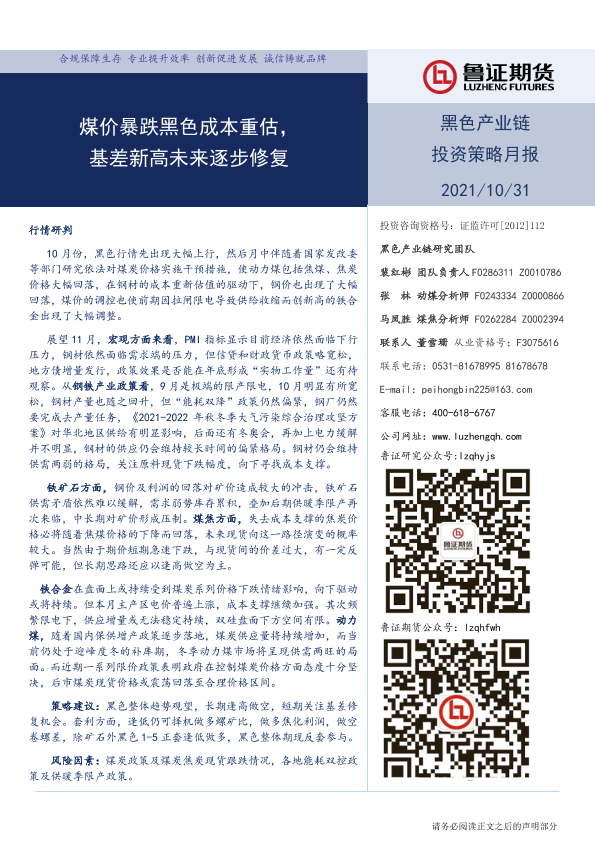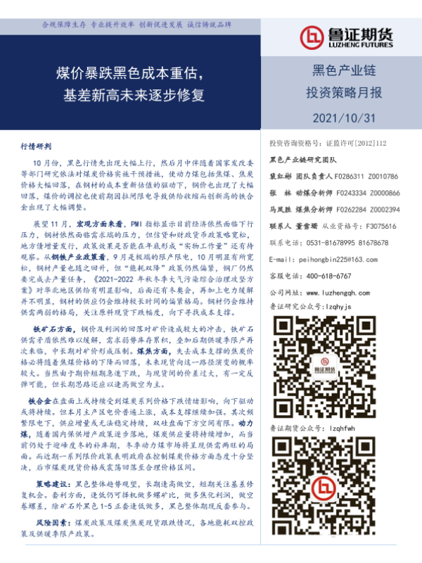 【鲁证期货】【20211031】黑色产业链投资策略月报:煤价暴跌黑色成本重估,基差新高未来逐步修复-23页