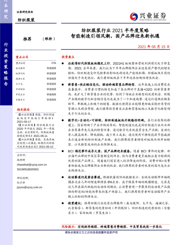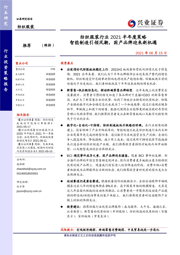 【兴业证券】【20210615】纺织服装行业2021半年度策略:智能制造引领风潮,国产品牌迎来新机遇-40页