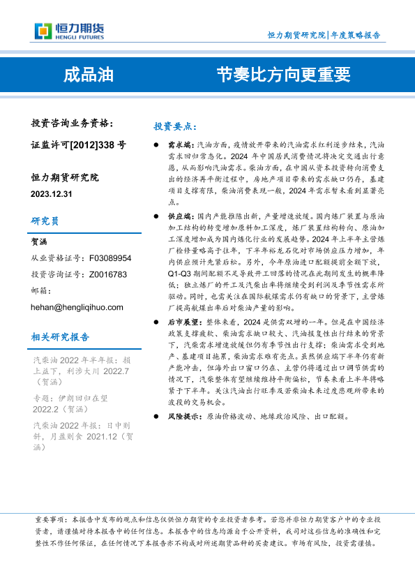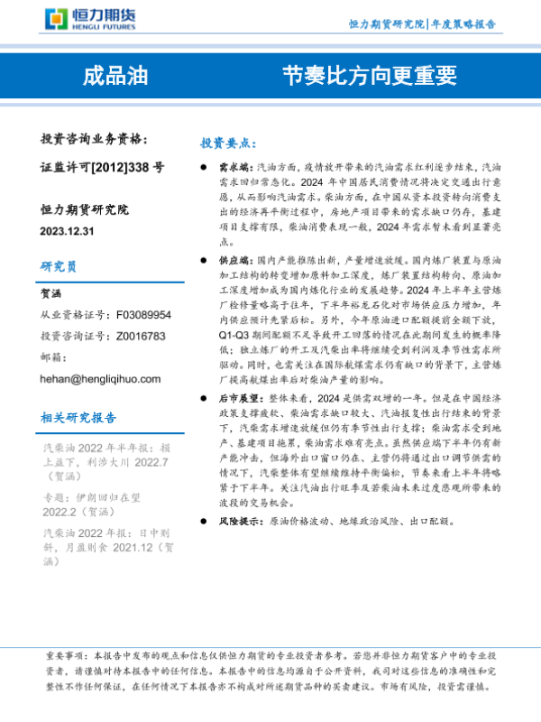 【恒力期货】【20231231】成品油年度策略报告:节奏比方向更重要-20页