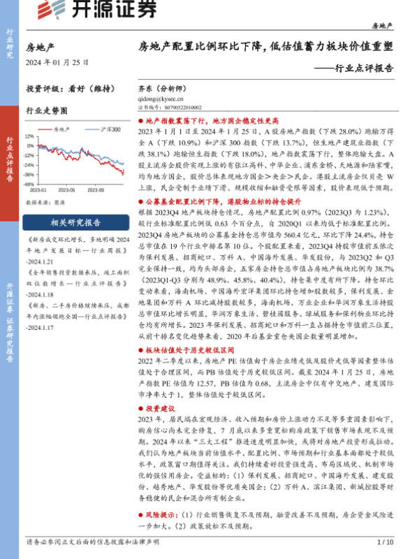 【开源证券】【20240125】房地产行业点评报告:房地产配置比例环比下降,低估值蓄力板块价值重塑-10页