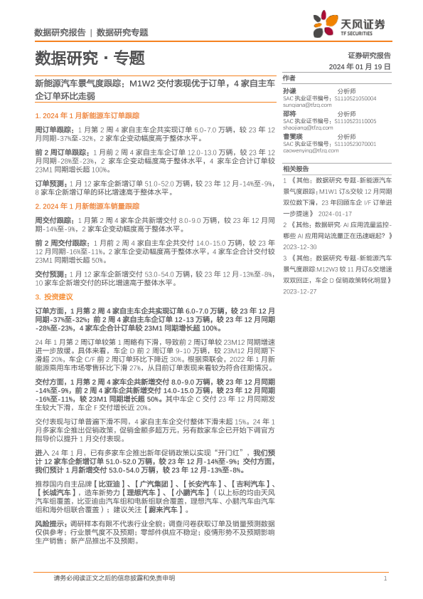 【天风证券】【20240119】新能源汽车景气度跟踪:M1W2交付表现优于订单,4家自主车企订单环比走弱-12页