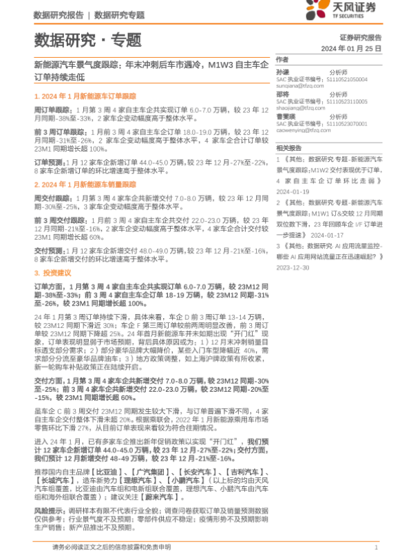 【天风证券】【20240125】新能源汽车景气度跟踪:年末冲刺后车市遇冷,M1W3自主车企订单持续走低-12页