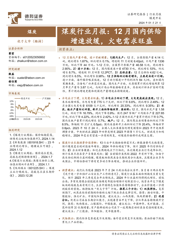【德邦证券】【20240121】煤炭行业月报:12月国内供给增速放缓,火电需求旺盛-11页