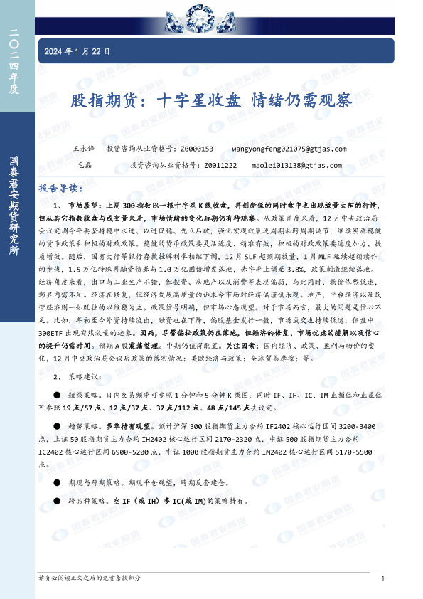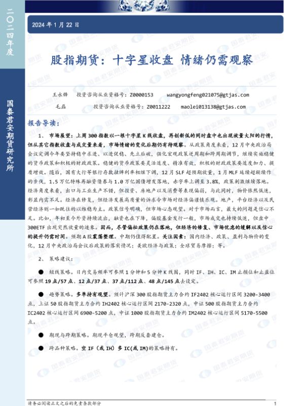 【国泰君安期货】【20240122】股指期货:十字星收盘 情绪仍需观察-21页